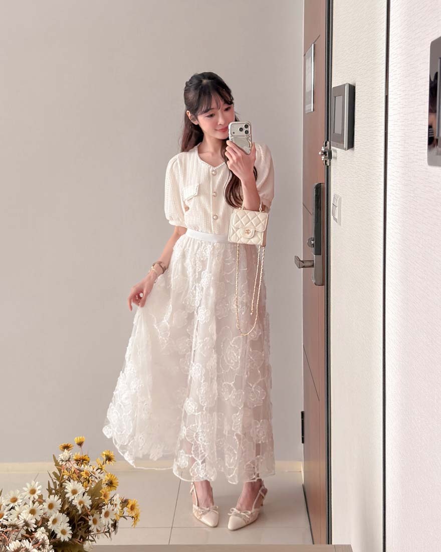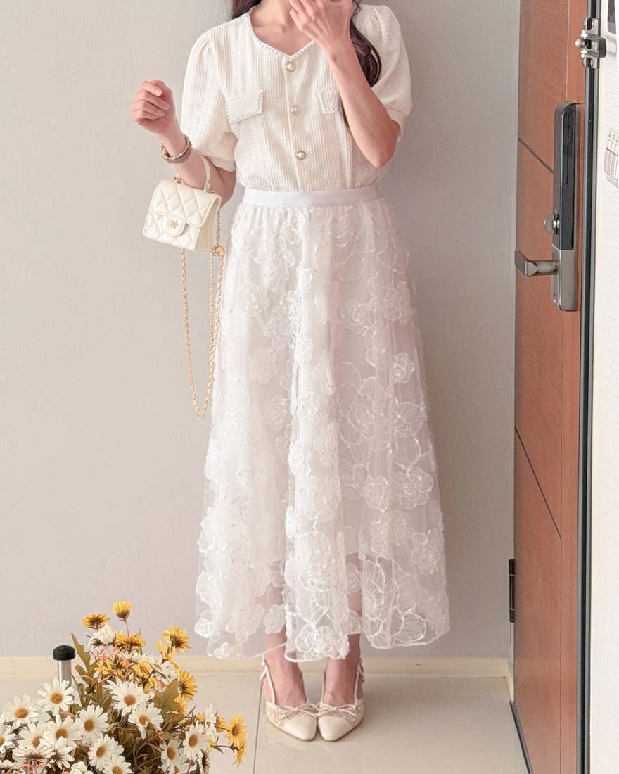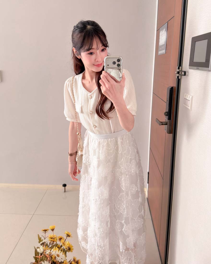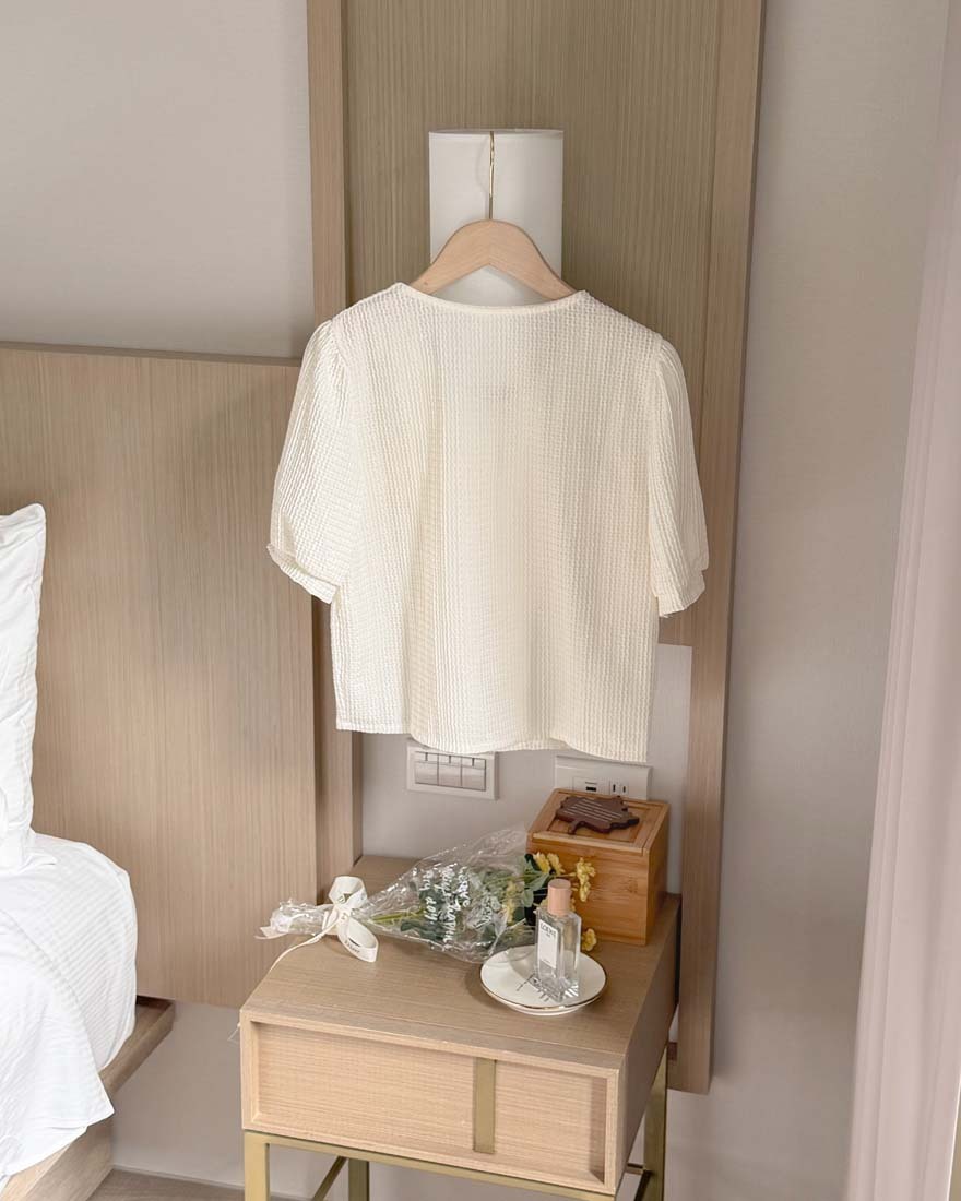 LINA LINA輕甜千金珍珠滾邊華夫格排釦上衣-淡鵝黃