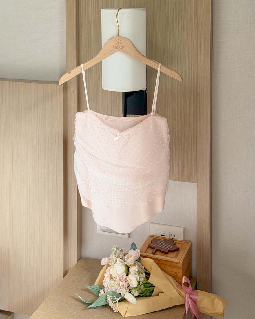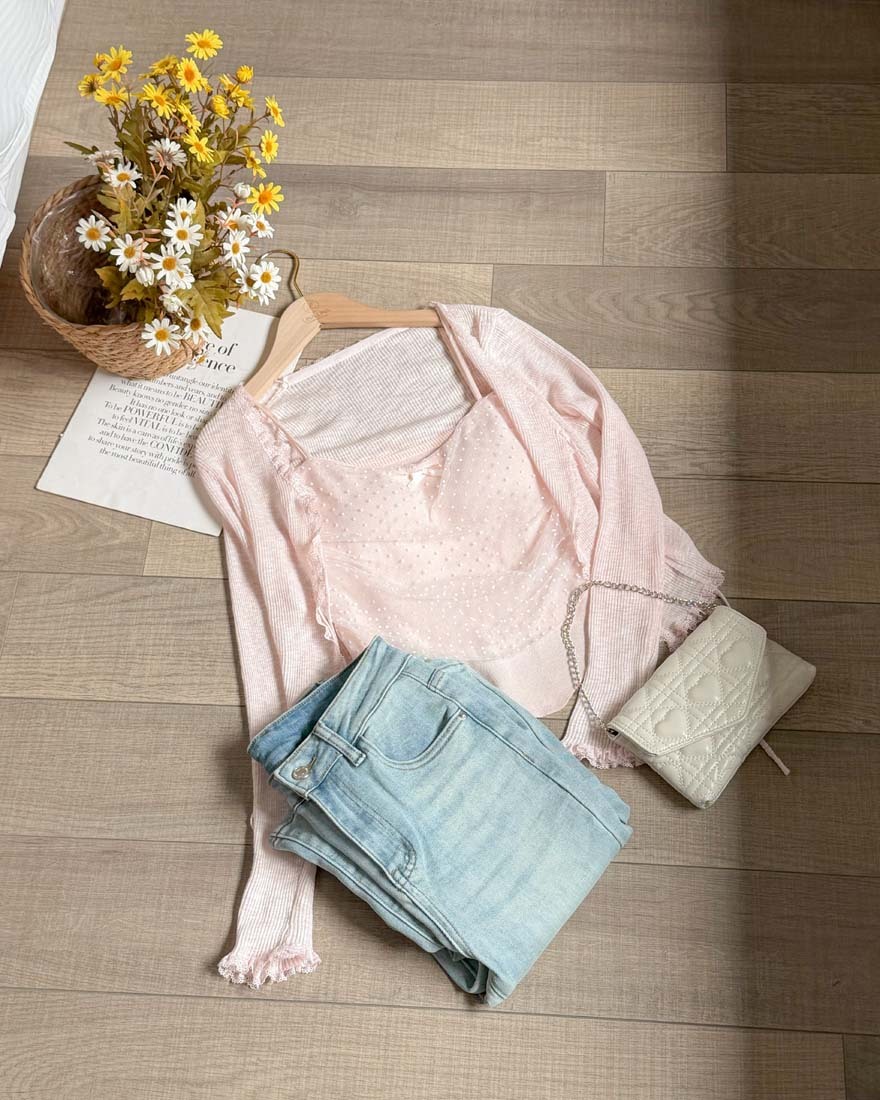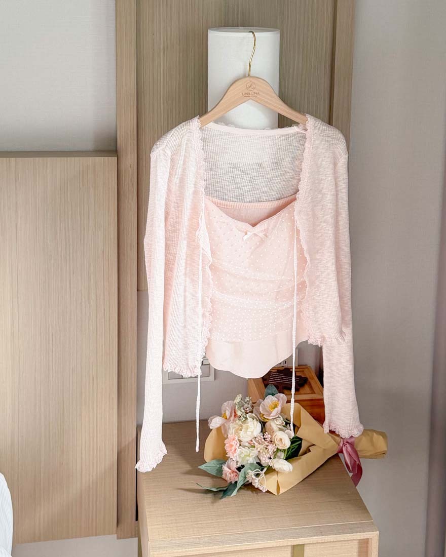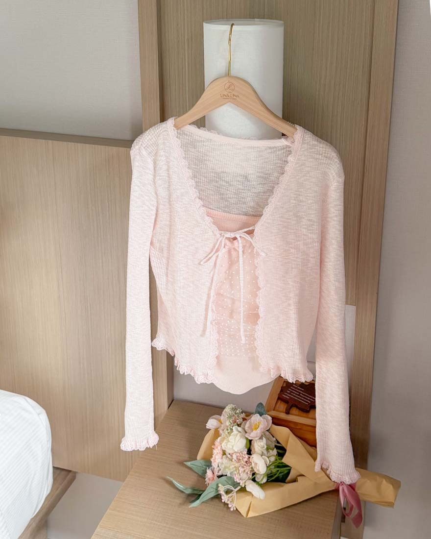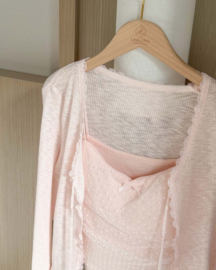 LINA LINA漂亮法則波點上衣蕾絲外套兩件組-櫻花粉
