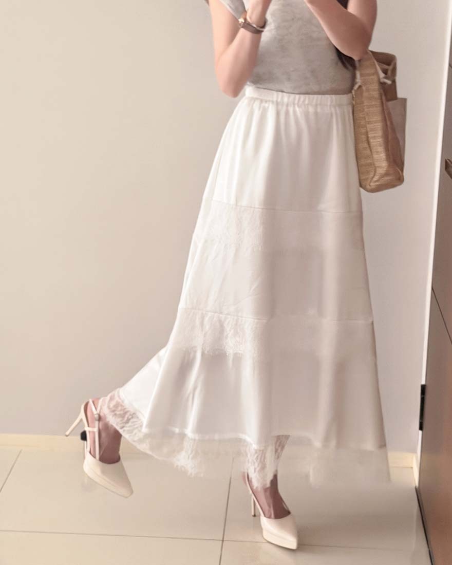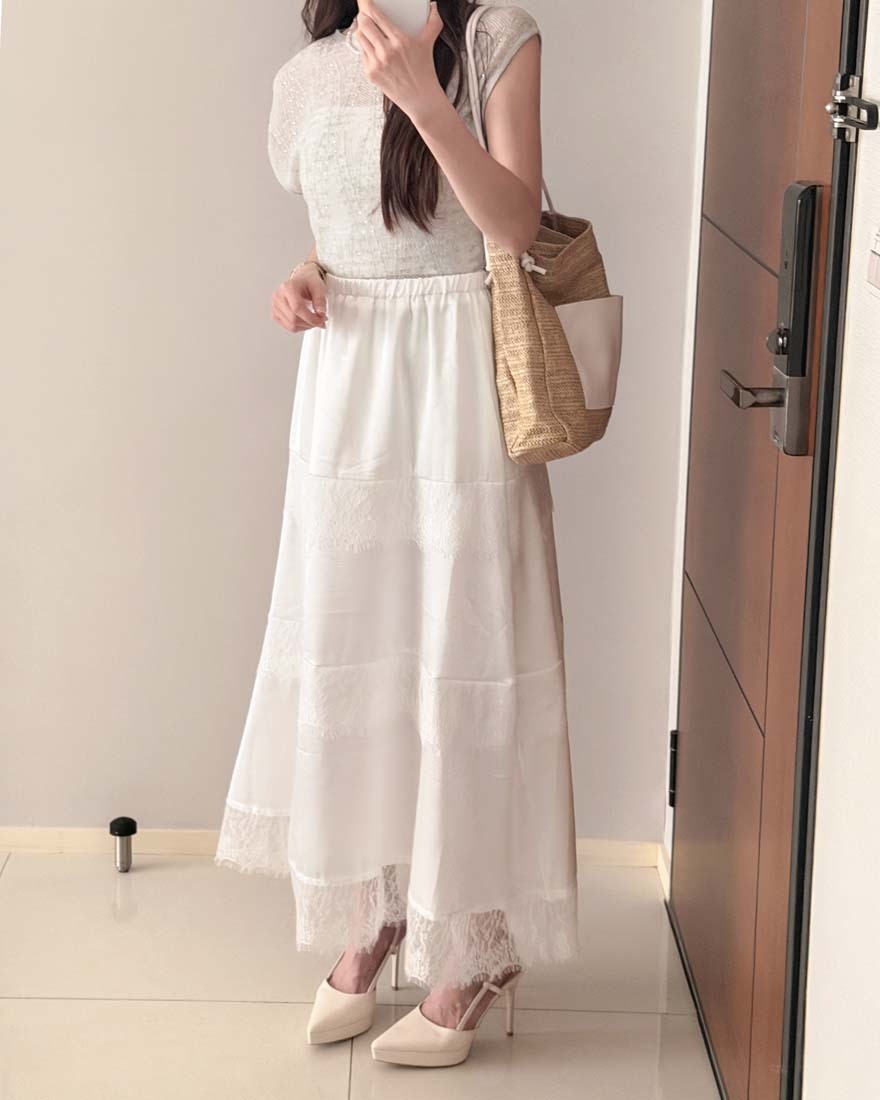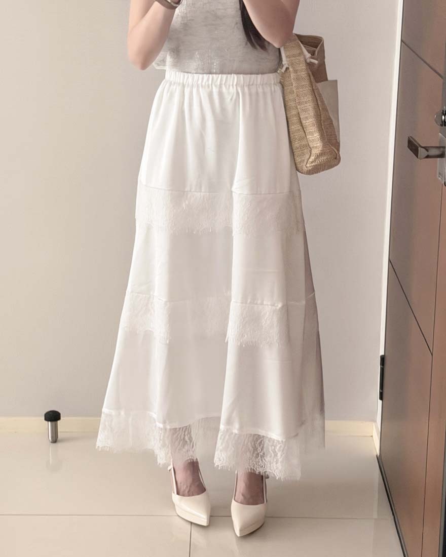 LINA LINA柔美漫步睫毛蕾絲滾邊光澤緞面長裙-仙氣白