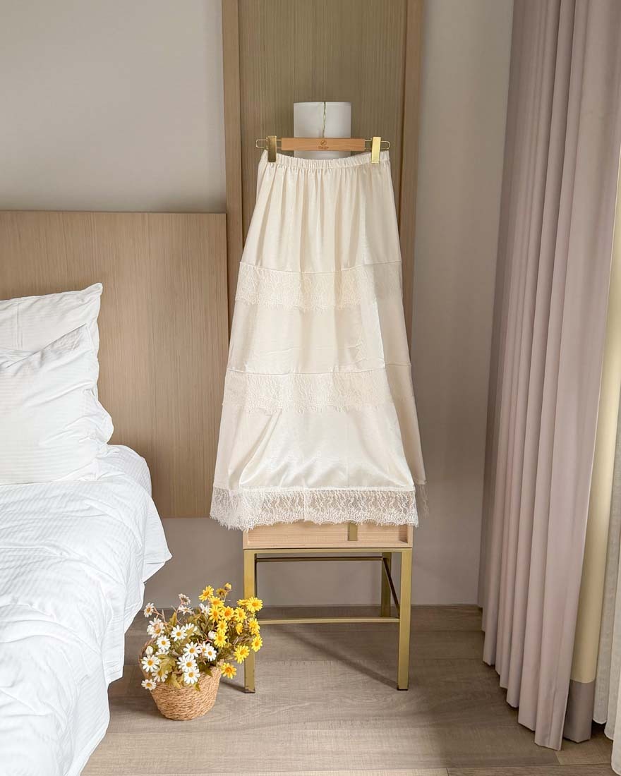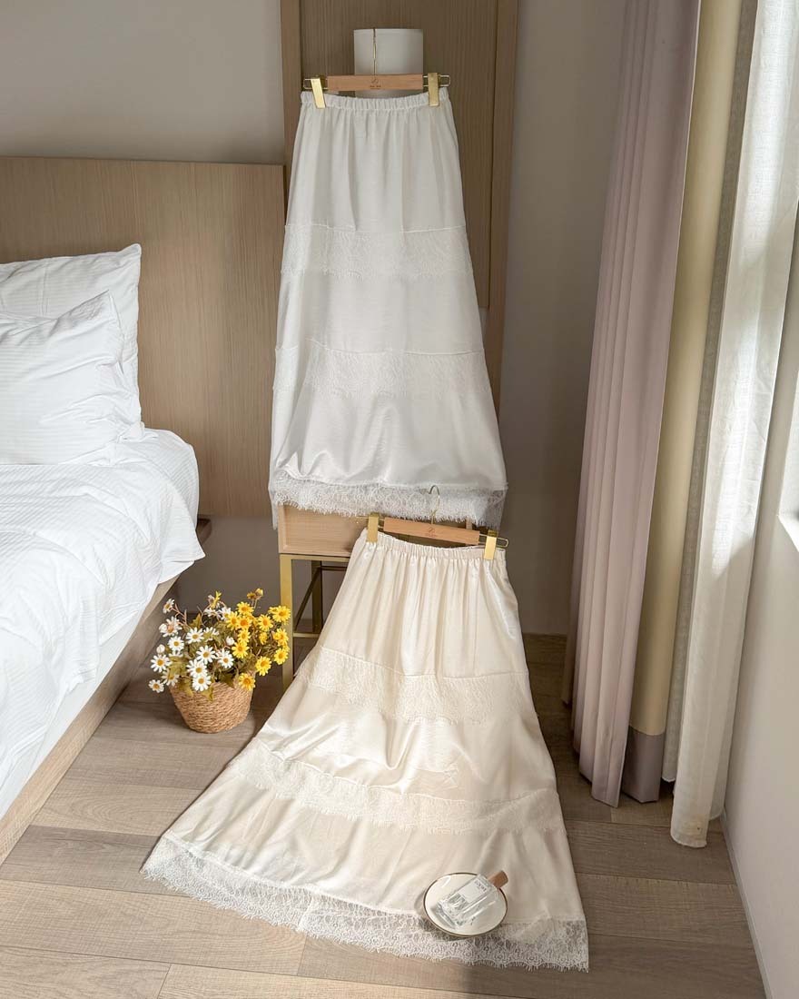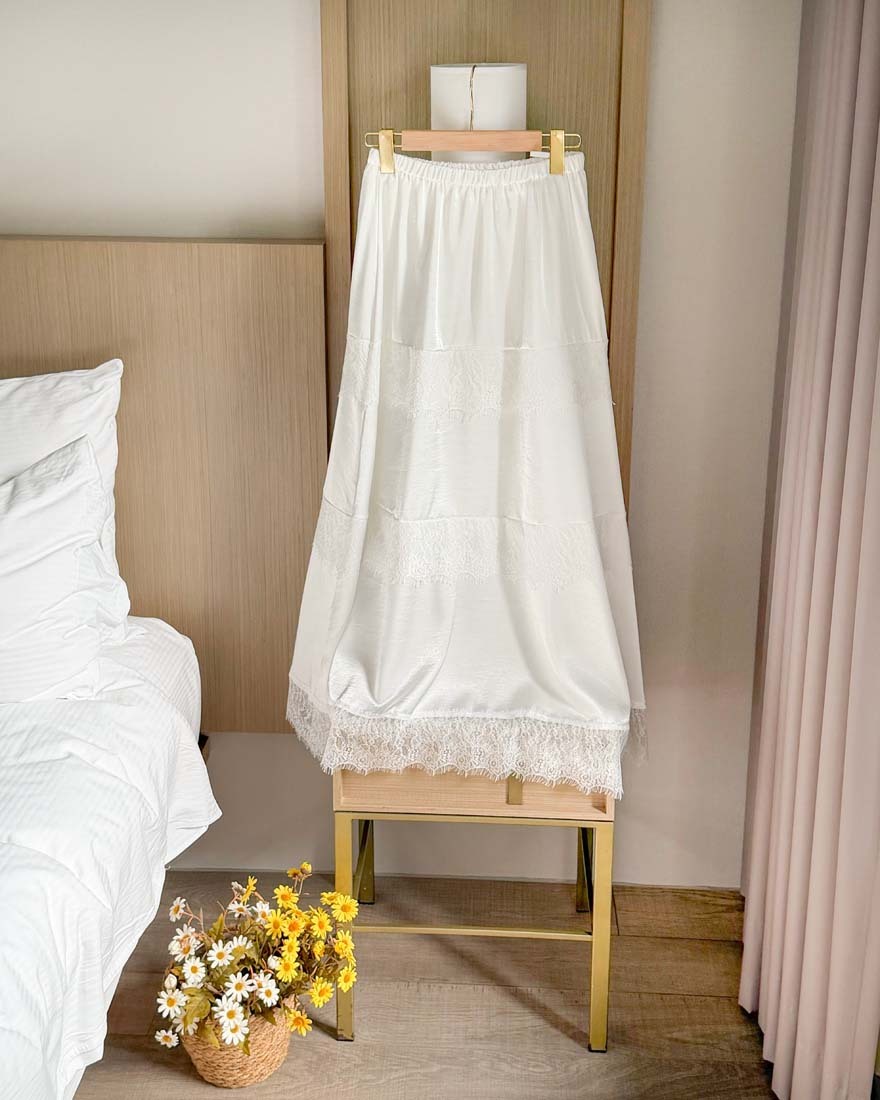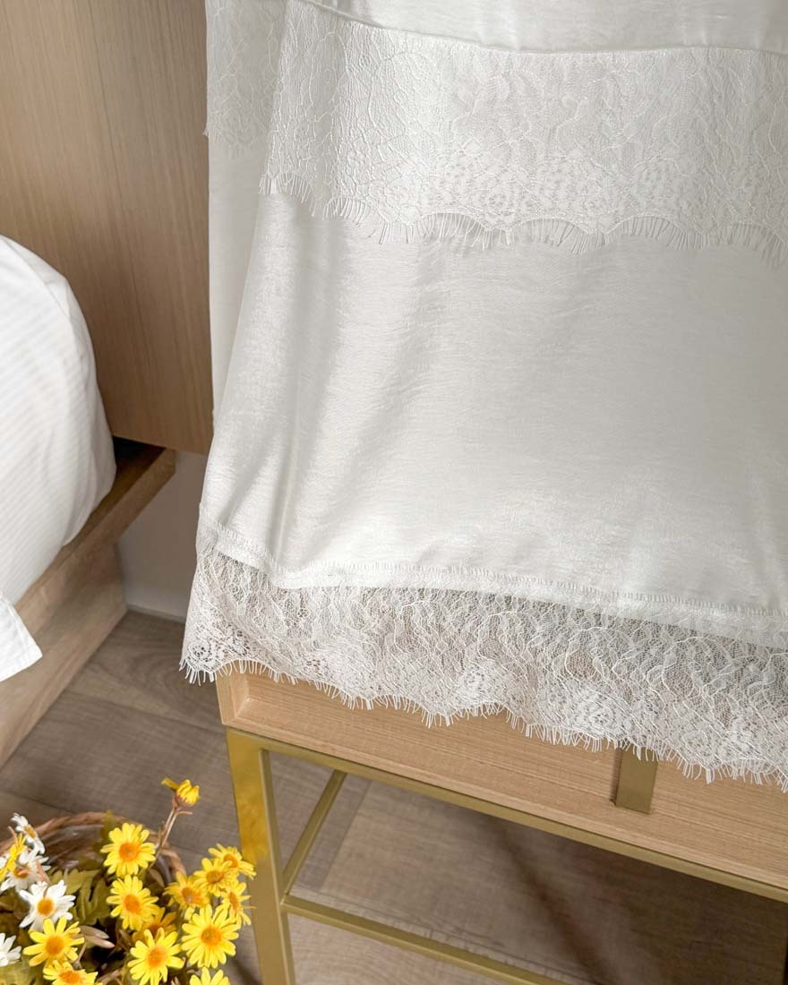 LINA LINA柔美漫步睫毛蕾絲滾邊光澤緞面長裙-仙氣白