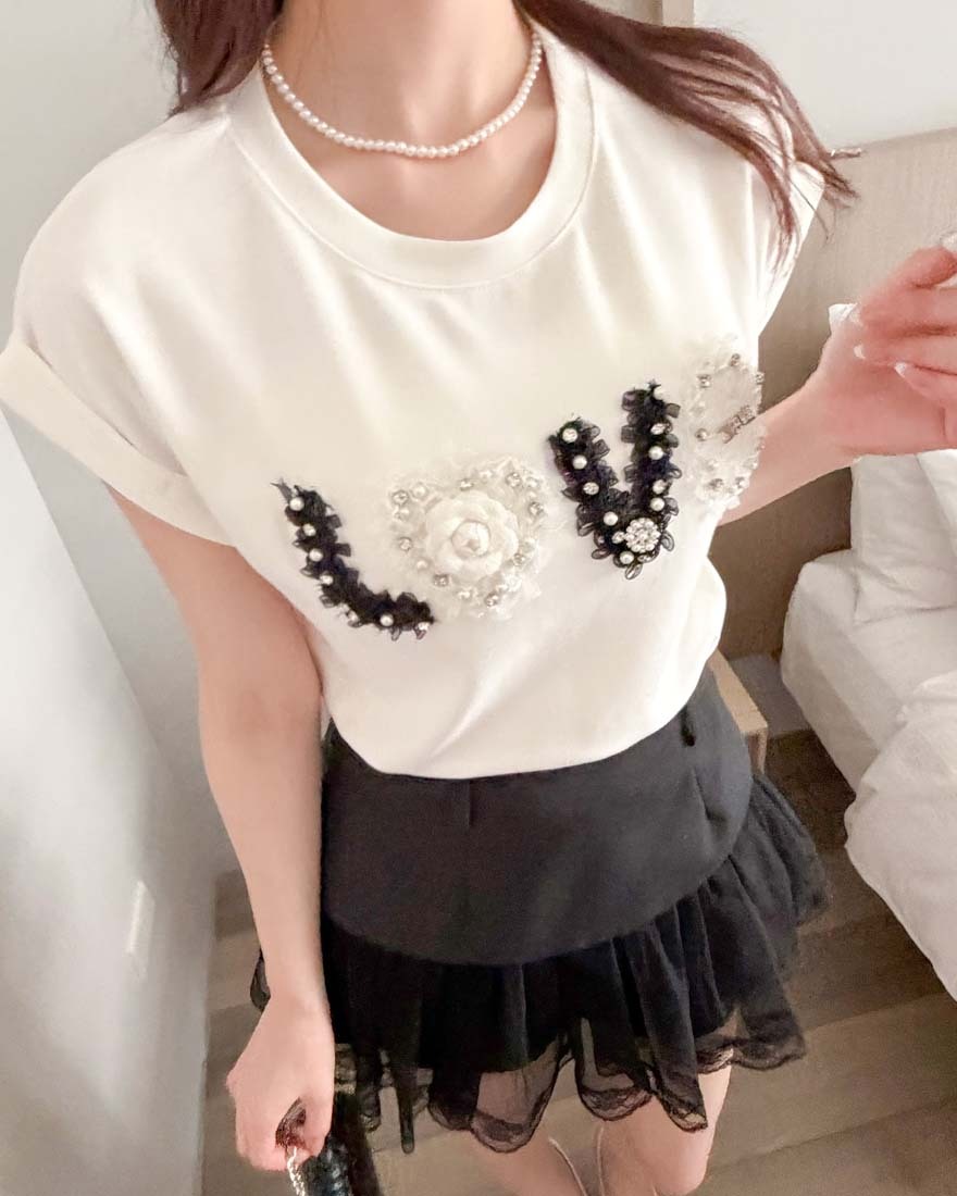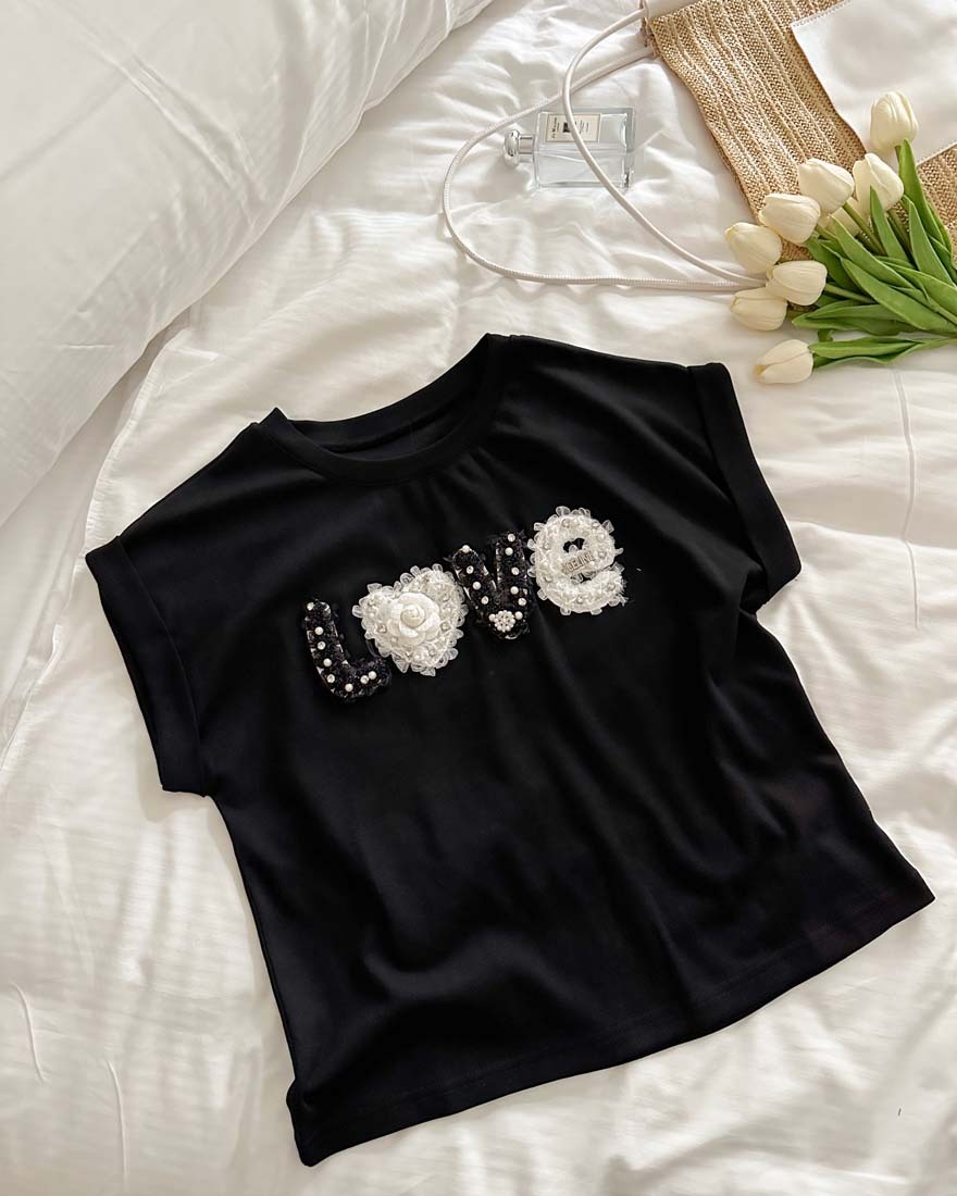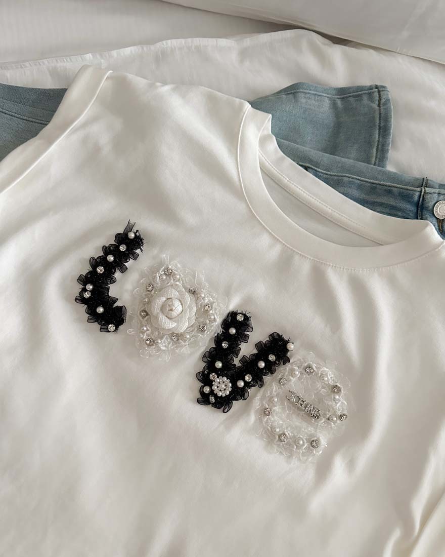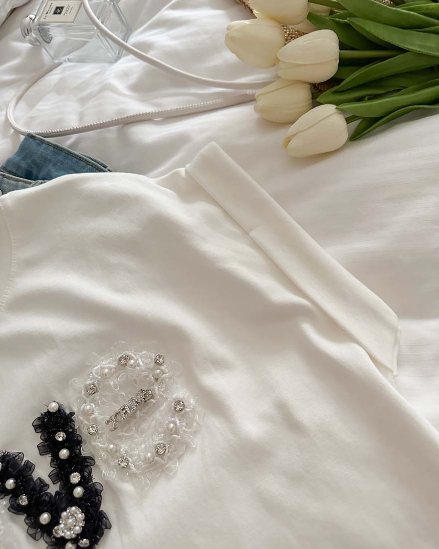 LINA LINA別緻日章珍珠鑽石山茶花英文標語棉T-簡約白