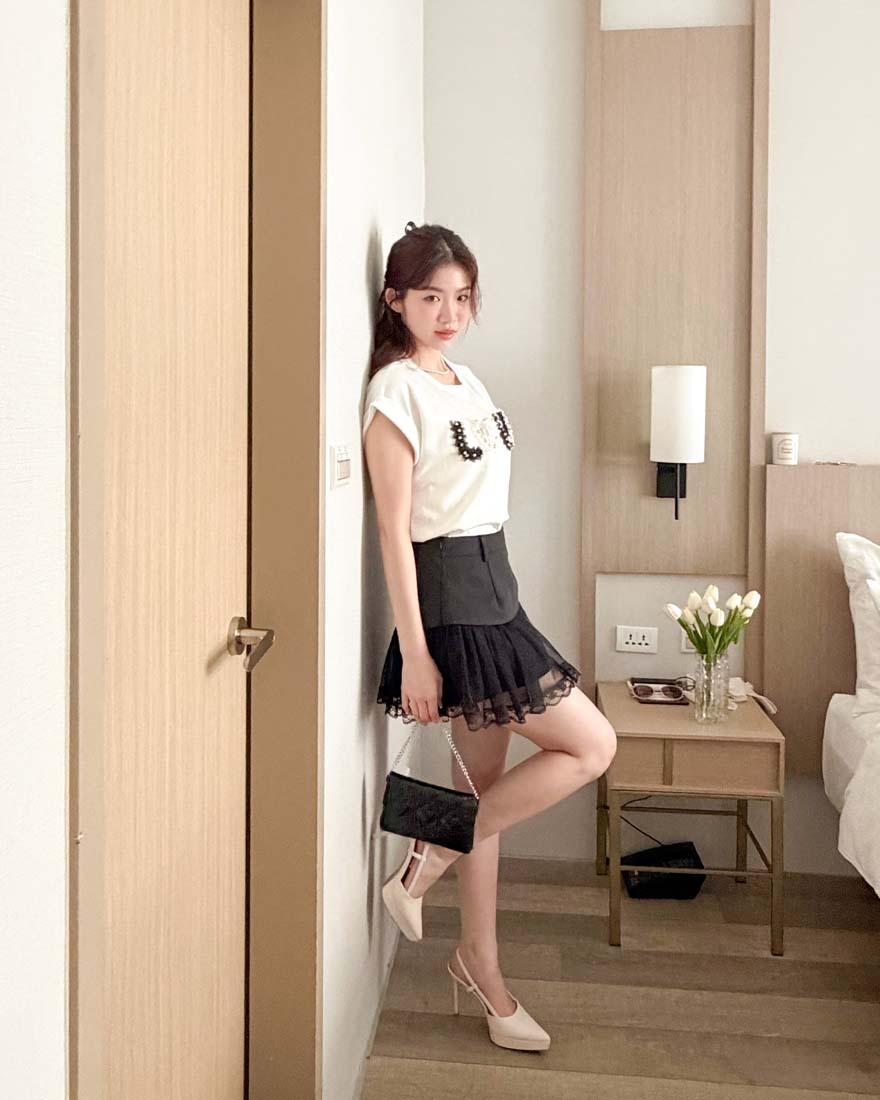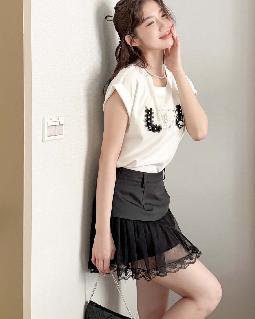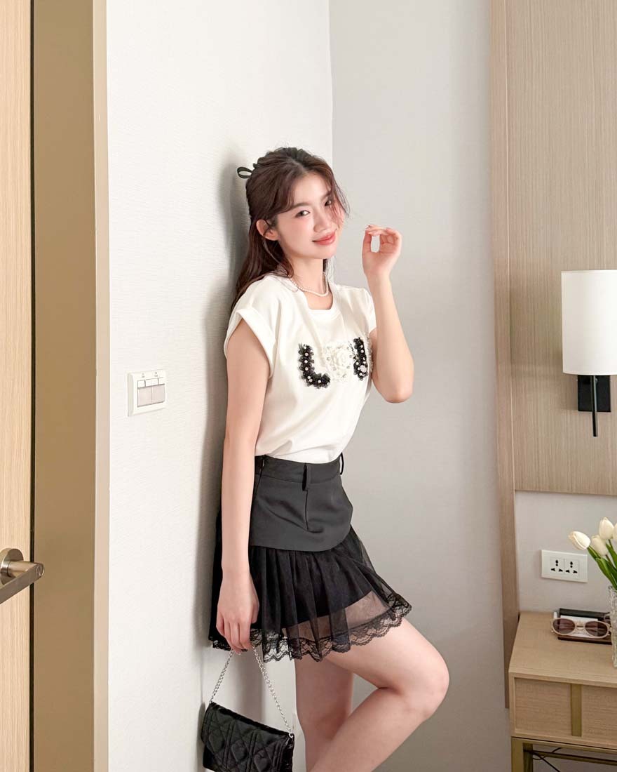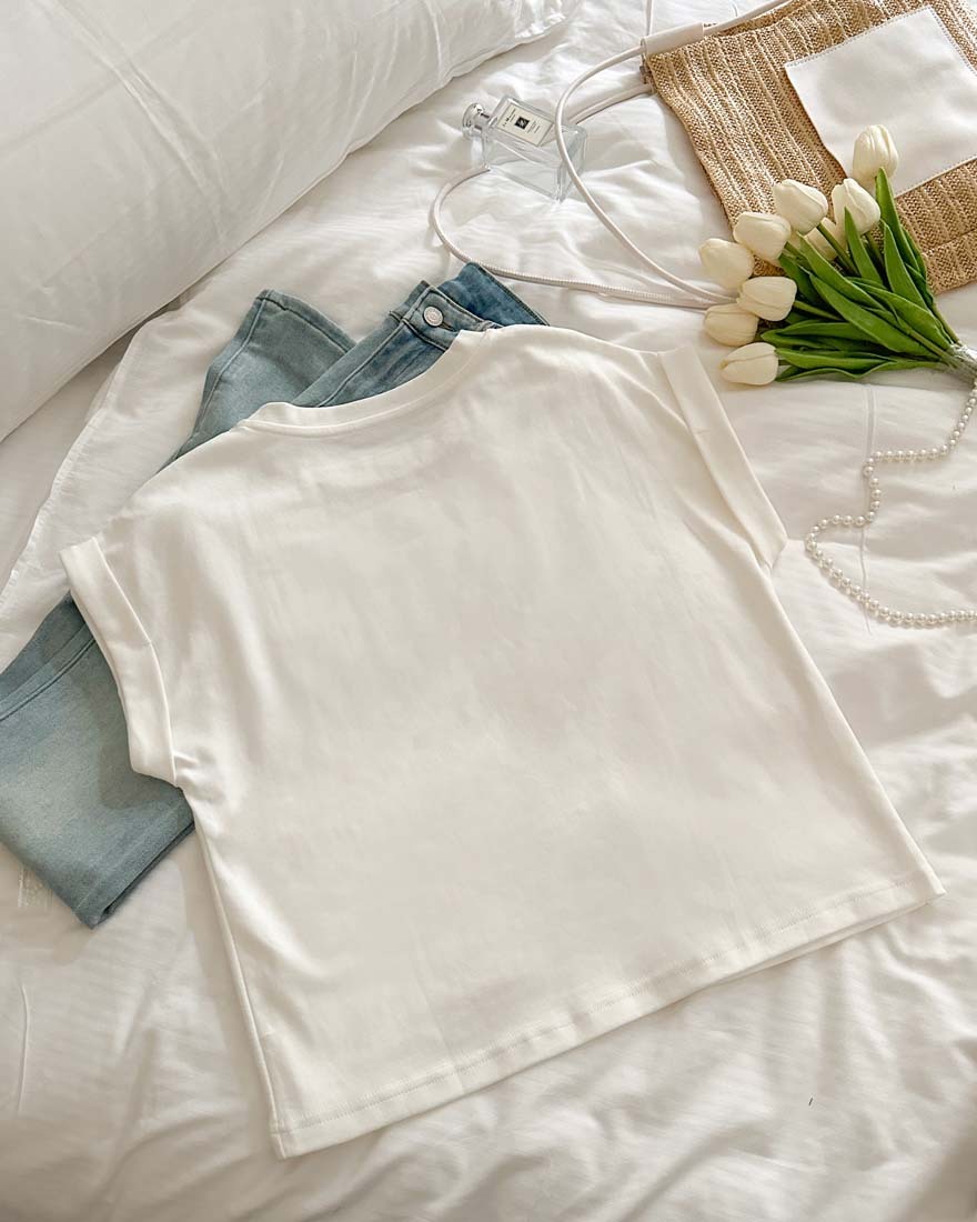LINA LINA別緻日章珍珠鑽石山茶花英文標語棉T-簡約白